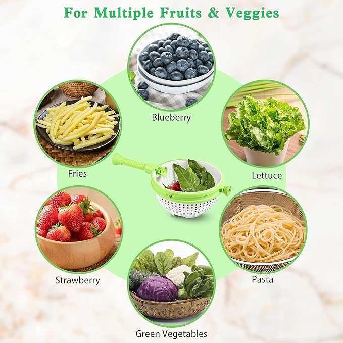 Make washing, drying, and serving fruits and vegetables effortless with this Multi-Purpose spinning and straining colander - Salad Spinner, Vegetable Dryer & Food Strainer. Designed for speed and convenience, it spins your greens dry in seconds—no shaking or messy draining required. Perfect for salads, pasta, berries, or any fresh produce.